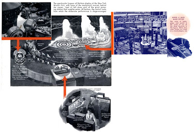 As we noted in previous EPCOT 1939 articles, the overall design of EPCOT Center was distinctly analogous to that of 1939 exposition. Similar to World Showcase, the Fair's Government Zone, which was comprised of pavilions representing both states and nations, was located in similar fashion behind the technology and commercial zones and featured a body of water at its center. It was there that the Fair's designers decided to create " . . . a scene to thrill thousands," as noted in the Popular Science article. The article was accompanied by a detailed illustration of the behind-the-scenes mechanisms that produced the show.