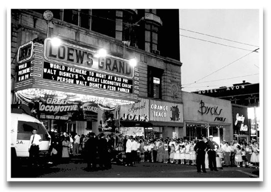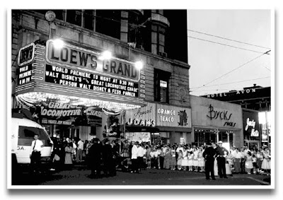 Just over five decades ago, the city of Atlanta played host to both Walt Disney and Fess Parker, as the marquee of the Loew's Grand indicates in this photograph from June of 1956. The occasion was the world premiere of the movie The Great Locomotive Chase, which starred Parker, who was fresh with fame from the Davy Crockett episodes of the Disneyland television program. The Loew's Grand was the subject of a prior Windows to the Past post where it had a more direct Davy Crockett connection.