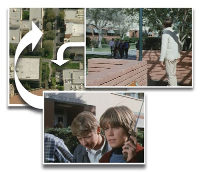 When Dean Higgins (played by Joe Flynn) stares out his meeting room window, he is looking at a panoramic backdrop of the Walt Disney Studios in Burbank. It is the same backdrop that was often used when Walt Disney filmed introductions to the Disney television program on an office set on a studio soundstage. When Dexter Riley (Kurt Russell) and his friends gather outside the college's administration building, they are in fact on an outdoor patio not far from the southern end of what was then the Animation Building. Set designers placed a sign over an entrance to the building, identifying it as SCIENCE BUILDING.