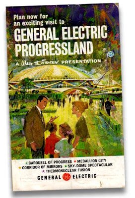 Here are the descriptions the same Guide provided for the Fair’s Disney-designed attractions:GENERAL ELECTRIC, B12. From lightning flash to nuclear fusion —man's search for energy. You revolve around a six-section circular stage and see Disney's Carousel of Progress. Audio-animatronic "people" tell story of electricity's contribution to your living. Time Tube carries you to Corridor of Mirrors and viewing terrace to see lightning storm, flames shooting from sun. Look for: First public demonstration of nuclear fusion in giant domed theater; continuous shows.