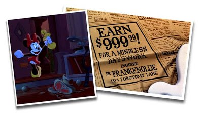 Desperately in need of a $1000 windfall, Mickey follows a want ad to the laboratory of simian mad scientist Dr. Frankenollie, whose devious plan is to do a brain swap between the mouse and his monstrous lab assistant Julius. Frankenollie features, albeit briefly, the voice talents of Kelsey Grammer, while Julius is in fact portrayed by Disney career villian Pete, whose peg leg was returned after a fairly extended PC-related sabbatical. Brains are switched, the good doctor is incinerated, and the short plunges into a frantic paced tour de force of action and heroics with a rough and tumble cityscape atmosphere more akin to recent Spiderman flicks than to traditional Mickey Mouse adventures.