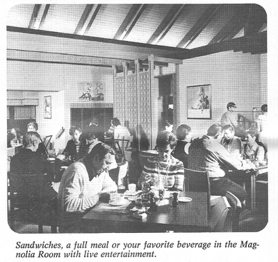 relatively minor 125 rooms in a large, multi-winged two story structure, built of wood and volcanic rock in the style of a country club. The amenities included the Magnolia Room, later the Trophy Room, serving Breakfast buffet from 6:30 am - 11:30 am ($3.25 adults, $1.75 children), lunch from 11:30 am - 2:30 pm, and dinner from 5:30 pm - 10 pm. A large, open room with a high-timbered cathedral ceiling, minimally decorated,