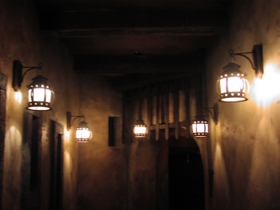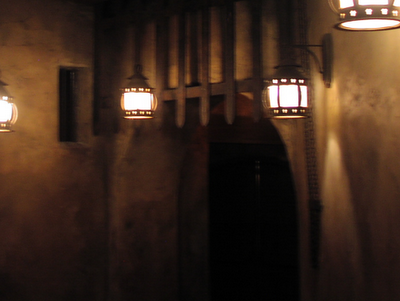 George casts a long shadow over the Cast imagination. The town scenes which constitute the bulk of the Florida version of the show are contained in a single, huge room which has a large, central pillar supporting its' roof. The top of this pillar is decorated to appear to be a multi-windowed tower, and can be seen to the right of Carlos' house in the Well scene. If you are lucky, you may even see a lonely little light burning in it. This pillar is supposedly the one which George fell from, and his initials, carved on the bottom of the pillar, cannot be painted over - they will bleed through the paint. The tower is called "George's Tower" - a play on the term for the ride's central control booth overlooking the Load area, called "Tower" - and has a special trick to it. If one sees a light burning in George's tower from the Well scene, it means that George is "home". If you get to the fire scene and look back up to George's Tower (the two scenes are only a few feet away from each other, on the other side of the village facades), and if that light is still burning in George's Tower - it often is not - then something bad is about to happen.