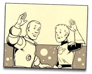 Accompanying each of these chapters is a mock comic book that features the adventures of Commander Cap Crater and his young sidekick, the Cosmic Kid. These two characters are thinly vieled four-color incarnations of Buddy and Pop, and similarly journey through the decades, with each era's comic book brilliantly reflecting that time frame's comic book culture. The publisher creatively delivers these pages via halftone-dot newsprint.