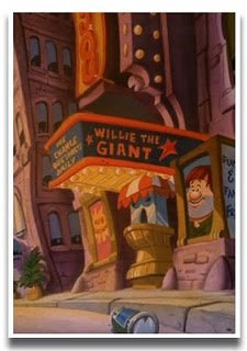 Though initially introduced as a villain in the Mickey and the Beanstalk segment of Fun and Fancy Free, he quickly evolved into a more benign, comedic character. He threatened Mickey, Donald and Goofy quite effectively throughout their adventures at the top of the beanstalk, but his was certainly a more child-like villainy as demonstrated by his frequent juvenile frolicking and quick to ignite temper. Willie's directing animator John Lounsbery masterfully injected both menace and silliness into the giant's split personality. Willie appears to meet a tragic end as most beanstalk giants do, falling from the sky to his implied off-screen death. But he is quickly resurrected for the film's epilogue in which he lifts the roof off Edgar Bergen's home and politely asks if anyone has seen a mouse. He then lumbers through Hollywood on his search, pausing momentarily to appropriate the California Crazy architecture of the famous Brown Derby restaurant and use it as head wear.