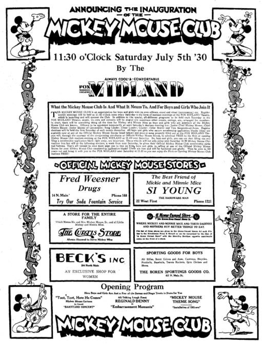 THE MICKEY MOUSE CLUB is an organization for boys and girls with its own officers, creed and ritual (ceremonies,) etc. Regular weekly meetings will be held at 11:30 o'clock noon every Saturday in the form of matinee-meetings at the FOX MIDLAND Theatre, which is launching and will sponsor the Club. In addition to the special, all-different programs to be held each Saturday in the FOX MIDLAND Theatre, stunts, try-outs and contests will be staged and numerous other events, outings, etc., arranged for members. In short, there will be something doing all the time for Mickey and Minnie Mice as boys and girls who are members of the Mickey Mouse Club are known. Officers to be appointed temporarily at next Saturday's matinee-meeting are: Junior Chief Mickey Mouse; Chief Minnie Mouse; Junior Master of Ceremonies; Song Leader; Cheer Leader; Courier; Color Bearer and Two Sergeants-at-Arms. Regular elections will be held the first Saturday of each month thereafter. All boys and girls who secure membership application blanks (they are available now at any of the Official Mickey Mouse Stores listed below) and present same properly filled out at the FOX MIDLAND Theatre will, through the courtesy of the co-operating merchants or Official Mickey Mouse Stores, be admitted FREE to the first or opening Mickey Mouse Club matinee-meeting at the FOX MIDLAND at 11:30 next Saturday. So, boys and girls, you can see that filling out and filing a membership application blank right away, are important. Those who do will not only enjoy next Saturday 11:30 Mickey Mouse Club matinee free but will at the following matinee, a week from next Saturday, be given their Official Mickey Mouse Club membership cards and buttons. That's all—except to once more urge you to lose no time boys and girls, in calling at one of the Official Mickey Mouse Stores for your Mickey Mouse Club membership application blank! These are free and will be furnished you gladly. Then be sure to fill yours out and bring it with you to the FOX MIDLAND next Saturday at 11:30 so you can enjoy the First or Opening Mickey Mouse Club matinee FREE!