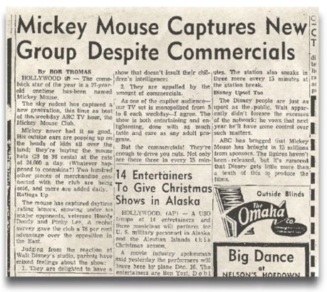 So said well known newspaper columnist and future Walt Disney biographer Bob Thomas in an article published on December 3, 1955. Thomas was discussing the tremendous success of the The Mickey Mouse Club television show that had debuted just a few months earlier, but was at the same time lamenting the glut of commercials that accompanied the program. Here in the 21st century, the average television viewer can expect anywhere from 20-30 commercials during a typical hour's worth of network television.