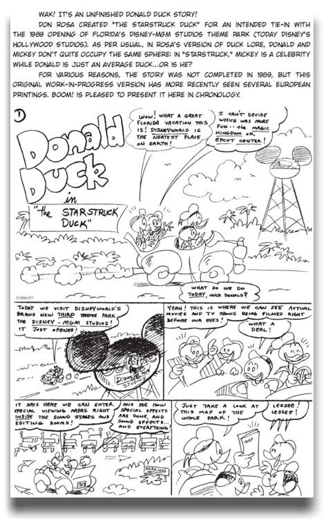 As part of an upcoming collection of Don Rosa Donald Duck stories, Boom! Comics is releasing a previously unpublished work that would have tied into the opening of the Disney-MGM Studios back in 1989. The Starstruck Duck, only produced as rough breakdowns, chronicled Donald and his nephews visiting the Disney World theme park and Donald's quest for the autograph of the world's biggest star--Mickey Mouse. Even in its very rough draft state, the story is still very clever and entertaining. It is part of Walt Disney Treasury: Donald Duck Volume 1, the first in a series of trade paperbacks reprinting Rosa's Donald Duck stories in chronological order.