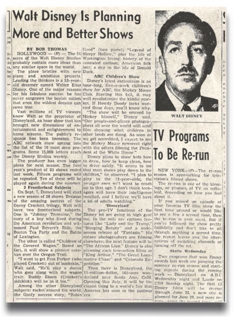 Spring of 1955 was a busy time for Walt Disney. The Disneyland television show was nearing the completion of its first season, the opening of Disneyland the park was just a few months away and The Mickey Mouse Club would premiere on ABC the following September. Newspaper columnist Bob Thomas provided a look at the state of Disney productions in this article from March 15, 1955: