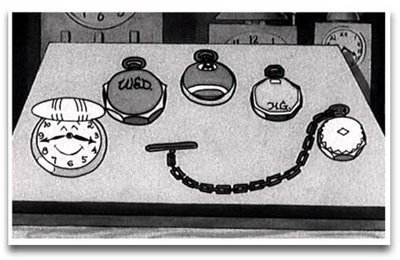 Even in the very early years of the Disney Studio, animators were paying homage to themselves and other studio personalities in the very cartoons they were producing. In the 1931 Silly Symphony The Clock Store, two pocket watches appear, marked with the engraved initials of their supposed owners. The initials W.E.D. are a quite obvious reference to Walter Elias Disney, but the initials of H.G. are a bit more mysterious.