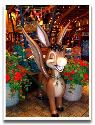 The little flying donkey Burrito flew in to assist Panchito at his general store at Disney's Coronado Springs Resort at Walt Disney World. Burrito featured prominently in the Flying Gauchito segment of The Three Caballeros; Panchito is of course the Caballero that hails from Mexico.