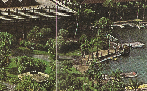 So here it is, the Captain Cook's Hideaway dockside patio. Though the torches ringing the patio burn bright, and it may not be dark enough yet to get the full effect of a romantic candlelight, it is bright enough to see that palm tree extending through the patio on the left and that circular building out by the pool in the background. This means that Captain Cook's Hideaway occupied a spot *just west* of the current location of the food court it later gave its name to, and where the indoor arcade is now. This image is from the 1977 "Walt Disney World ... a pictorial souvenir".