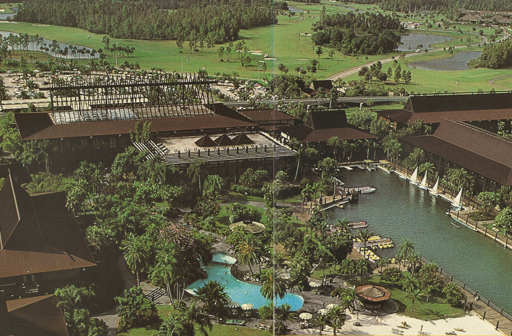 "Time takes on a leisurely tempo in the romantic South Seas environment of the Polynesian Village. As guests wander along palm-lined paths beside tropical pools, the throb of Tahitian drums announces the nightly torchlit luau held on the white-sand beach i front of the low-silhouetted guest "longhouses"."