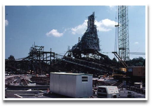 Big Thunder Mountain Railroad was a work-in-progress when this photograph was taken in 1979. According to author and Imagineer Jason Surrell in his book The Disney Mountains, "At two and a half acres, the attraction was a full twenty-five percent larger than the Disneyland adaptation." He adds, "At 197 feet (and change) tall, Big Thunder became the tallest 'mountain' in Florida, a record that hasn't been broken, even by the mighty Mount Everest."