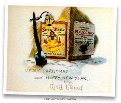 One of the very best designs from the Disney Studio Christmas cards comes from 1938. Pinocchio was still over a year away from release when this snowy scene foreshadowed its coming.