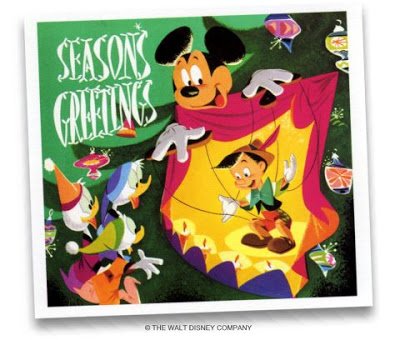 Mickey entertains Donald's nephews with a very special little wooden boy. This card was sent out from the Disney Studio in 1953.