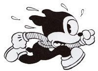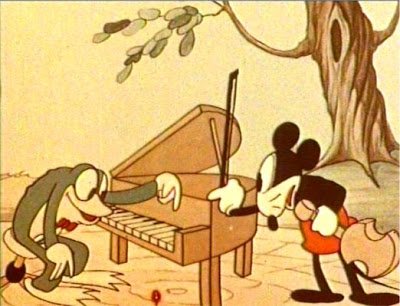 Flip doesn't speak in FIDDLESTICKS, his first film; he dances on stage for the other forest animals and provides piano accompaniment for a mouse who plays the violin. This mouse bears a definite resemblance to Mickey, particularly with his white shorts and gloves, but the face is less rounded, and the addition of whiskers obscures any direct plagiarism.