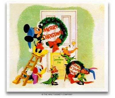 King Brian and his fellow leprechauns give Mickey and Donald some help with the holiday trimmings. This Studio card anticipated the June 1959 release of Darby O'Gill and the Little People.