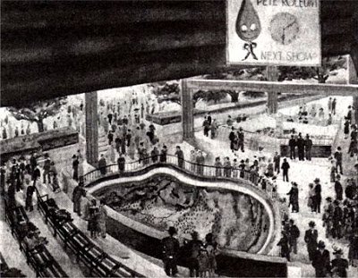 Sponsored by eighteen different companies, the Petroleum Exhibit was a generally modest endeavor compared to many of the Fair’s other attractions. The official Guide Book of the New York World’s Fair reflected the exhibit’s lack of flair with the following fairly brief and uninspired description:Plainly land marked by a towering oil derrick in actual operation, the Building (Voorhees. Walker. Foley & Smith, architects; Gilbert Rohde, designer) fronts on the Avenue of Pioneers. Shaped like an equilateral triangle, the structure rests on four huge oil tanks, its metal walls rising in flaring tiers. Four large murals by William T. Schwarz decorate the inner walls of the Great Hall of Industry, each depicting respectively one phase in the story of Petroleum — Production, Transportation. Research and Refining. Here on a mammoth stage a motion picture in technicolor, its actors three-dimensional puppets, portrays the importance of petroleum in man's daily life. The Petroleum Garden on the roof is featured by an animated map on which miniature oil derricks depict the growth of oil production since 1860. A model of an oil refinery demonstrates the most up-to-date refining methods. Sponsored by fourteen major oil companies, the Exhibit shows how the industry has made possible and contributed to the advance of civilization during the past 80 years.
