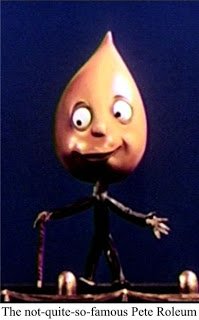 The subject of energy was pretty much as dry then as it was at EPCOT Center in 1982, and a certain amount of window dressing was required for both to create interesting and entertaining presentations. At EPCOT, animatronic dinosaurs, sprawling theater cars and snappy songs generally countered the Universe of Energy pavilion’s mostly low key films and Exxon sponsored public relations. Lacking the sophistication and flare of late 20th century technology, the Petroleum Exhibit had to settle for a motion picture called Pete Roleum and his Cousins. And what an incredibly weird bunch of characters they were.Animated oil droplets tell the story of petroleum production in a disjointed and often extremely strange series of vignettes, ending with a chorus line musical number that is both bizarre and more or less incomprehensible. This is partly due to the fact that a person at the exhibit interacted with the film's narrator, and those scripted lines are absent from the film.
