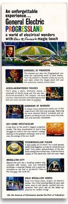 Here are the descriptions the same Guide provided for the Fair’s Disney-designed attractions:GENERAL ELECTRIC, B12. From lightning flash to nuclear fusion —man's search for energy. You revolve around a six-section circular stage and see Disney's Carousel of Progress. Audio-animatronic "people" tell story of electricity's contribution to your living. Time Tube carries you to Corridor of Mirrors and viewing terrace to see lightning storm, flames shooting from sun. Look for: First public demonstration of nuclear fusion in giant domed theater; continuous shows.