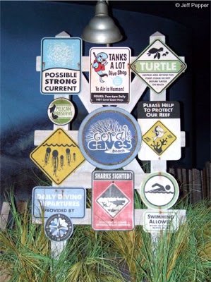 The queue area for The Seas With Nemo and Friends at Epcot is one of the real highlights of the attraction. The center sign identifies the area as Coral Caves Beach. Most of the key characters and settings from Finding Nemo are represented in some way on the surrounding signs.