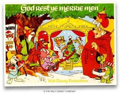 The characters from the animated feature Robin Hood are featured on the Studio Christmas card from 1973. I especially like the wanted poster on the tree with Robin wearing a Santa hat.