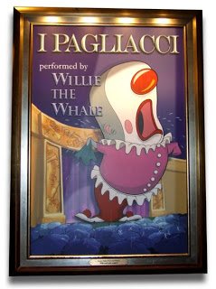 A series of posters highlight the queue area of Mickey’s PhilharMagic at the Magic Kingdom in Walt Disney World. Tying in to the music hall theme of the attraction, the posters take well-know Disney characters and feature them in faux promotional pieces for musical acts. The Three Little Pigs and Big Bad Wolf become the Wolf Gang Trio. Hercules’ villain Hades sings Torch Songs. Aladdin’s Genie sings the blues. The Little Mermaid and her sisters form Ariel’s Coral Group. And the Three Caballeros host the Festival de las Mariachas. But perhaps the most appropriate of the posters, befitting the attraction’s concert hall setting and use of “opera glasses,” would be the one that promotes I, Pagliacci, and features one of Disney’s more enormous stars, Willie the Whale.Enormous in physical size, if not in star stature.