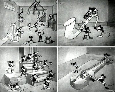 It is no small coincidence that the Mickey’s fellow mice bear striking resemblances to similar rodents from Disney’s earlier silent endeavors. The film is a remake of sorts of Alice Rattled by Rats, produced in 1925, and the character designs do not stray far from that short’s original cast. And these “supporting mice” contribute much of the cartoon’s content. Mickey’s antics are for the most part focused on a player piano and the typical cartoon gags that that instrument usually inspires. While somewhat mundane overall, the film’s shortcomings are easily forgiven in relation to its more relevant historical context.