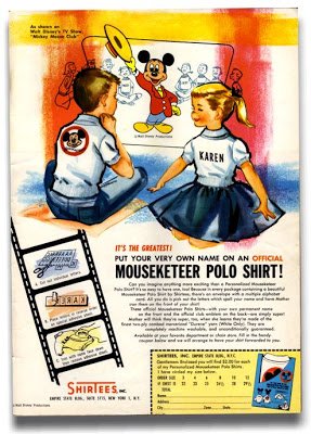 We mentioned in a post a few days ago how the original Mickey Mouse Club was a major part of 1950s popular culture, and this magazine ad from 1956 certainly bears that observation out. It was very important that the Mouseketeers at home identify with their television counterparts, and a genuine and OFFICIAL Mouseketeer Polo Shirt with its multiple alphabet card of iron-on letters could go a long way to making that happen.