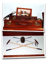 The store Mouse About the Town, located on Sunset Boulevard, features an assortment of Walt Disney polo-related props and photos. Vintage black and white photographs of Walt in polo garb adorn one wall, while nearby are sketches of scenes from Mickey's Polo Team. A color photo from the cartoon sits amidst travel-themed items on a high shelf, while a helmet, mallets and riding crops hang decoratively above the store's main entrance.