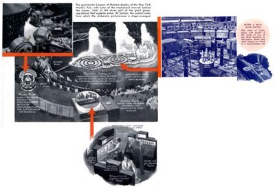 As we noted in previous EPCOT 1939 articles, the overall design of EPCOT Center was distinctly analogous to that of 1939 exposition. Similar to World Showcase, the Fair's Government Zone, which was comprised of pavilions representing both states and nations, was located in similar fashion behind the technology and commercial zones and featured a body of water at its center. It was there that the Fair's designers decided to create " . . . a scene to thrill thousands," as noted in the Popular Science article. The article was accompanied by a detailed illustration of the behind-the-scenes mechanisms that produced the show.