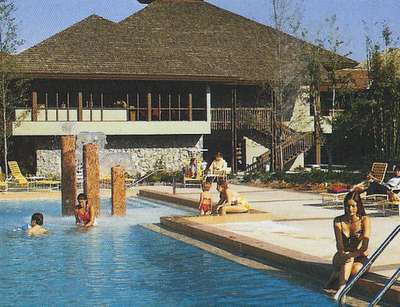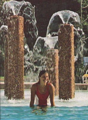 Well, if that doesn't sound too inspiring, then at least the Golf Resort had a neat swimming pool - outside of the Polynesian Village's influential and famous "grotto slide" pool, probably the neatest one at Walt Disney World in the 1970's. Its' location can be observed in the aerial photo above, as can its' most distinct feature - three water-spouting columns in the shallow portion of the pool. Long before Disney was creating beautifully themed pools like