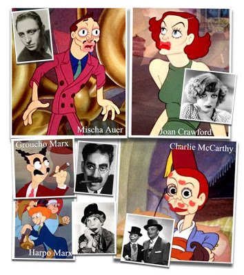 Mischa Auer, Joan Crawford, Groucho Marx and brother Harpo, and ventriloquist dummy Charlie McCarthy, although his right hand man Edger Bergen is noticeably absent. The pair would eventually appear in Disney's feature film