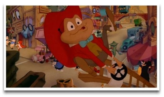 We are still exploring the avenues of Toontown in our series of Freeze Frame! posts related to the 1988 film Who Framed Roger Rabbit. Let us leave those dark and claustrophobic side alleys of our prior two posts and return to the zaniness of Toontown's main thoroughfares.
