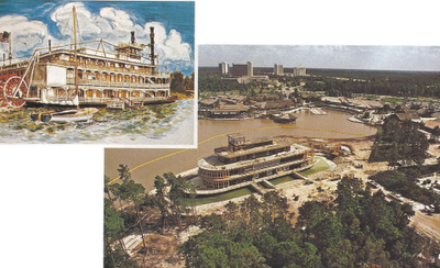 1977 brought more changes to the Village. The Shopping Village was originally built on the south-eastern side of an inlet, with Captain Jack’s Oyster Bar, as the northernmost building, facing a sylvan forest. A bit further north along the Village Lagoon (by now re-named the Buena Vista Lagoon), the Vacation Villas had, for five years, faced a little bar of land in the middle of the Lagoon as it narrowed into the canal system near the Lake Buena Vista Club. Disney dammed up an area to the north-west of the Pottery Chalet, sliced off several dozen feet of land off the Villages cozy cove - turning it into more of a bay - removed the island facing the Villas, and began construction of the Empress Lilly Riverboat.