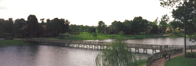 Probably the most charming of the Lake Buena Vista developments surrounding the Clubhouse, the Club Lake Villas were smaller one-family townhouse type accommodations with a bedroom, a square little living room generously splashed in sunlight thanks to dramatically vertical ceilings and skylights, and a kitchenette. They were clustered in little courtyards with roundabouts between each grouping of four, and each Villa looked out across Club Lake at the far side’s grouping of Villas. A long wooden footbridge was constructed to link the Villas on the north side of Club Lake with the Villas on the south side, which had their own pool and recreation facilities. Or one could follow the golf cart path onto the Lake Buena Vista Club and her pool and marina.
