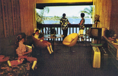 "Time takes on a leisurely tempo in the romantic South Seas environment of the Polynesian Village. As guests wander along palm-lined paths beside tropical pools, the throb of Tahitian drums announces the nightly torchlit luau held on the white-sand beach i front of the low-silhouetted guest "longhouses"."