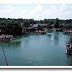 This panorama of the Rivers of America at Walt Disney World's Magic Kingdom highlights potential raft congestion as guests are ferried to and from Tom Sawyer's Island. The image dates from 1979. Construction cranes can be seen on the right; work was well under way to bring Big Thunder Mountain Railroad to realization. The docks for the Davy Crockett Explorer Canoes can be seen in the foreground.