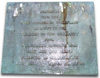 It presents a mystery for the uninitiated; no sign remains of the former attraction, and it is not identified by name on the plaque.Relocated from the Magic Kingdom of Disneyland as a gift to the children of this community from Marceline's favorite sons Walt and Roy Disney. Accepted in appreciation July 1966 Mayor C. A. Young