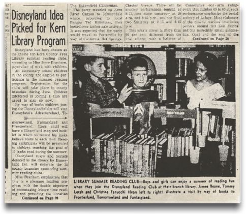 Disneyland has been chosen as the theme for Kern County Free Library summer reading clubs according to Miss Irene Branham, supervisor of work with children. All elementary school children in the county are eligible to participate in the summer reading program. Registration for the clubs will take place in county branches during June. Children interested in joining a club are urged to sign up now.By way of books, children joining the Disneyland clubs will visit Disneyland's Adventureland, Tomorrowland, Fantasyland and Frontierland. Each child will have a Disneyland map and booklet in which to record his make-believe visits to each land. Reading certificates will be presented to children reaching the goal of 10 books read during the summer. Disneyland maps and posters donated to the library by Disneyland Inc. will decorate the 35 county branches sponsoring summer reading clubs. Miss Branham emphasizes that this is a pleasure reading program with the double objective of encouraging leisure time reading and providing the librarian with an opportunity to give reading guidance to young patrons. The library's vacation loan, allowing children to borrow eight books for a period of six weeks, will enable children to continue reading for the club during the family vacation. Children and their parents may get further information about the summer reading program by visiting any branch of the Kern County Free Library.