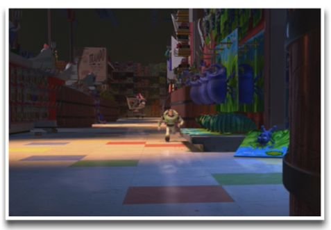 A few moments later, shortly after entering the store, Buzz runs past a display of A Bug's Life merchandise.
