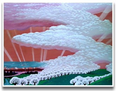 "What Melody Time lacks is unity. The paintbrush format and Buddy Clark's introductions are a poor substitute for cohesion, and, though one can enjoy the various segments, there is a feeling, when Pecos Bill brings the film to an abrupt conclusion, that something is missing. Fantasia was episodic, too, but one felt that it was cut from a whole cloth, as it were. There was never a feeling of fragmentation."It is an opinion with which I must respectfully disagree. The cohesion that Maltin found lacking is in fact present on a much more subtle yet still overriding level. The overall art direction of Melody Time represented a dramatic shift away from the more literal artistic interpretations that had characterized most Disney animation up until that point. Mary Blair, Claude Coats and Dick Kelsey, despite the episodic format, provided the film a unified visual style heavy with impressionistic influence and very atypical uses of color. It is a film that is consistently painted in very bold strokes and in many places truly bears the mark of Mary Blair's artistic genius. This is especially apparent in Once Upon a Wintertime, Trees and Johnny Appleseed. It is indeed ironic that Blair's legacy has been recently so wrapped up in It's a Small World, by individuals who tend to disregard efforts such as Melody Time where her talent and creativity are so better represented.