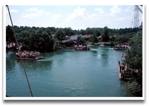 This panorama of the Rivers of America at Walt Disney World's Magic Kingdom highlights potential raft congestion as guests are ferried to and from Tom Sawyer's Island. The image dates from 1979. Construction cranes can be seen on the right; work was well under way to bring Big Thunder Mountain Railroad to realization. The docks for the Davy Crockett Explorer Canoes can be seen in the foreground.