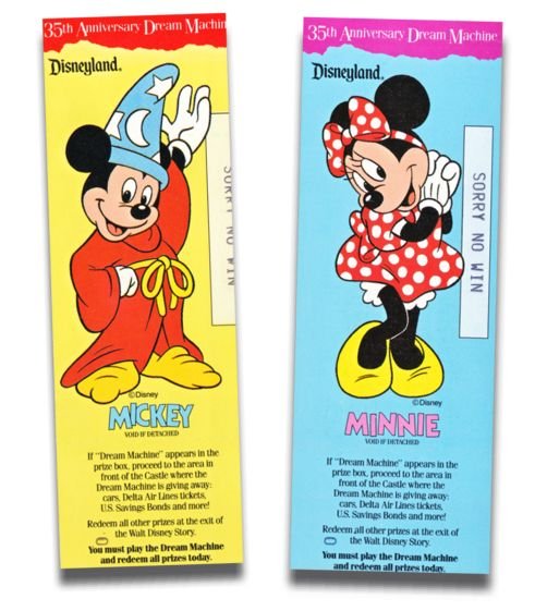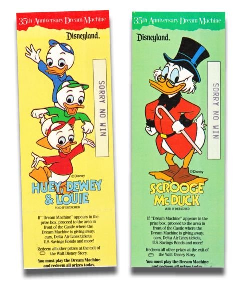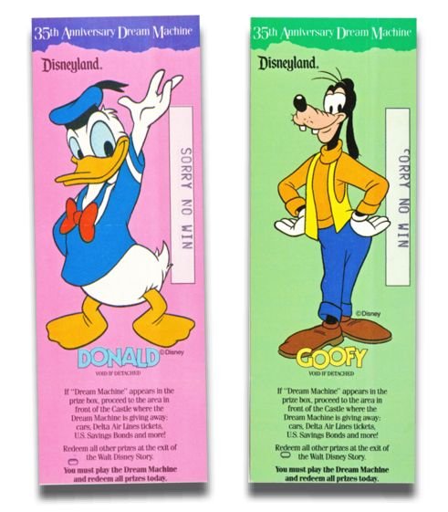 Some pieces of ephemera can have a very, very short lifespan. The perfect example: a Disneyland Dream Machine ticket. A component of Disneyland's 35th Anniversary celebration in 1990, these non-winning contest tickets were typically discarded within just a few feet of of the main entrance turnstiles where they were distributed. As near as we can determine, a complete set consisted of twenty-four variations, each with a different character or characters. There was also a single style that featured the 35th Anniversary logo by itself.