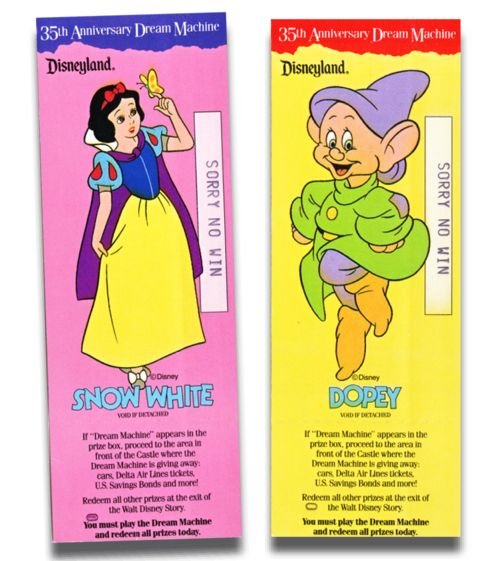 Winning tickets for commemorative pins were redeemed at the turnstiles. Other minor prizes were rewarded at the Disneyland Redemption Center near the exit of the Walt Disney Story on Main Street USA. If "Dream Machine" appeared on the ticket, the winning guest proceeded to the actual Dream Machine in front of Sleeping Beauty Castle. How did the Dream Machine work? Here's an explanation from the Spring 1990 issue of Disney News: